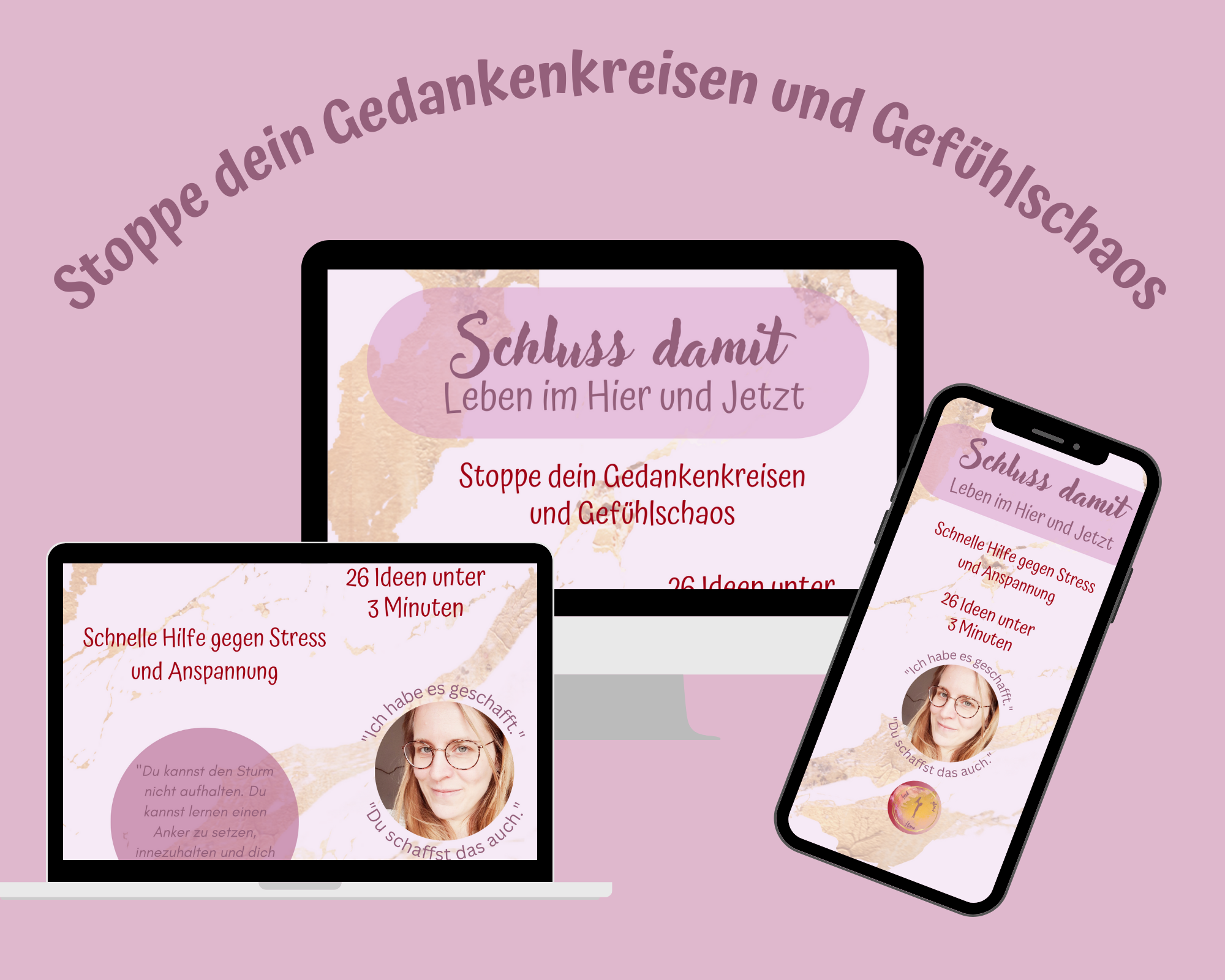 „Schluss damit – Leben im Hier & Jetzt“ ist ein Ebook im PDF Format, um dein Gedankenkreisen und Gefühlschaos zu durchbrechen. Du erhältst ein Sammelsurium aus verschiedenen Tipps und Tricks, 26 Ideen unter 3 Minuten, für den alltäglichen Gebrauch.